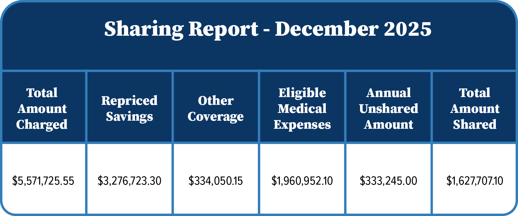 Below is Solidarity HealthShare’s sharing report for the month of December 2025. From December 1, 2025 to December 31, 2025 inclusive, Solidarity HealthShare received $5,571,725.55 in eligible medical needs on behalf of our Members, which was re-priced and shared at $1,960,952.10 .