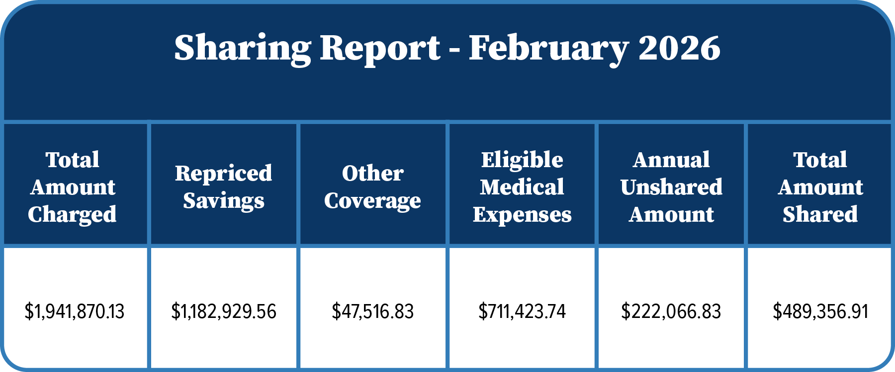 Below is Solidarity HealthShare’s sharing report for the month of February 2026. From February 1 through February, 2026 inclusive, Solidarity HealthShare received $1,941,870.13 in eligible medical needs on behalf of our Members, which was re-priced and shared at $711,423.74.